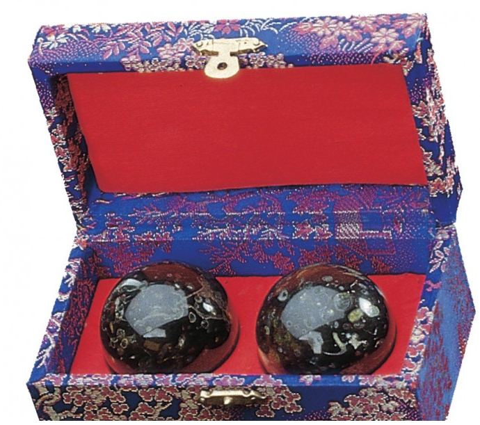 Kinesiske kugler er fremstillet af massivt, poleret sten. Beroligende for krop og sjæl - kan cirkulere i hånden. Kinesiske kugler kan forbedre fingerfærdighed og styrke håndens muskler. leverest som et par i en flot "silke" gaveæske. Mål: Ø 5 cm